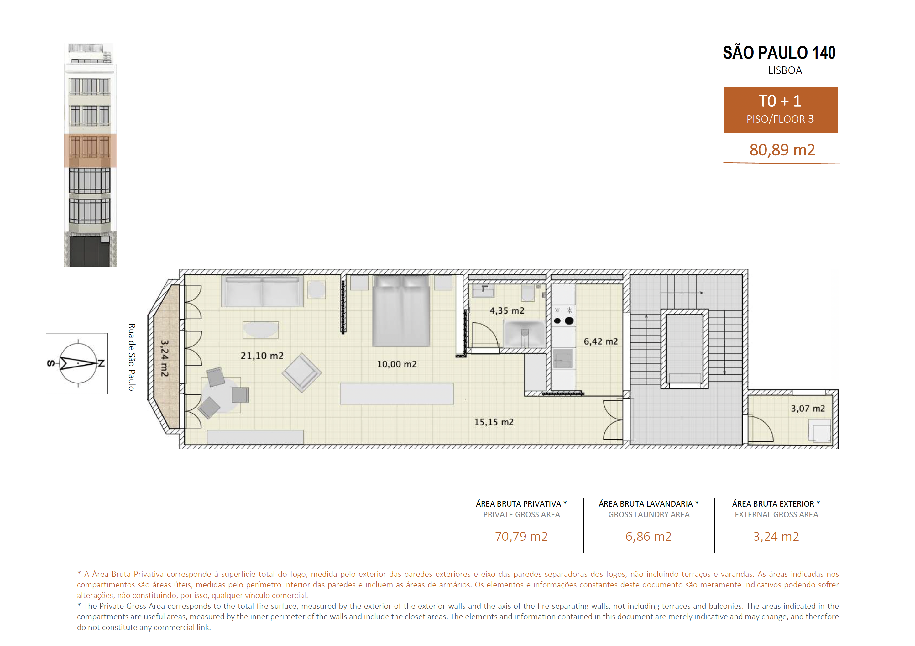 O apartamento oferece um layout moderno e funcional, com uma sala inundada de luz (e um pé direito superior a 3 metros), por onde se acede a um pequeno terraço com vista para a Igreja de São Paulo.